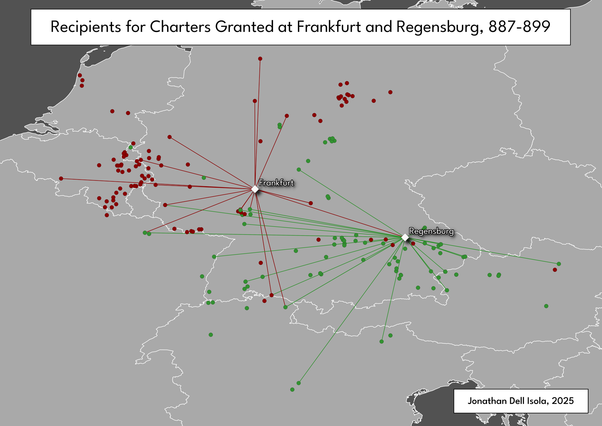 It is likely also that that the usage of Frankfurt was tied to the nature of Arnulf's early years, when a non-Carolingian king in Burgundy seemingly claimed Lotharingia as well. Frankfurt was closer to Lotharingia than Regensburg, making it easier for magnates to travel there for assemblies.[7] When Lothar II came to Louis the German in 855, along with some Lotharingian magnates, in order to secure Louis' sanctioning of his kingship, he went to Frankfurt.[8] Possibly, Frankfurt was a convenient location for these types of assemblies, and we can see this potentially reflected if we look at a map which shows the recipients of charters and the lands granted in those charters: