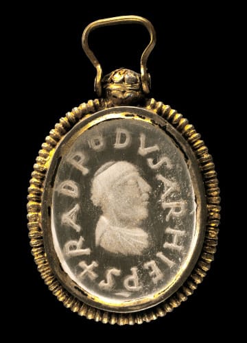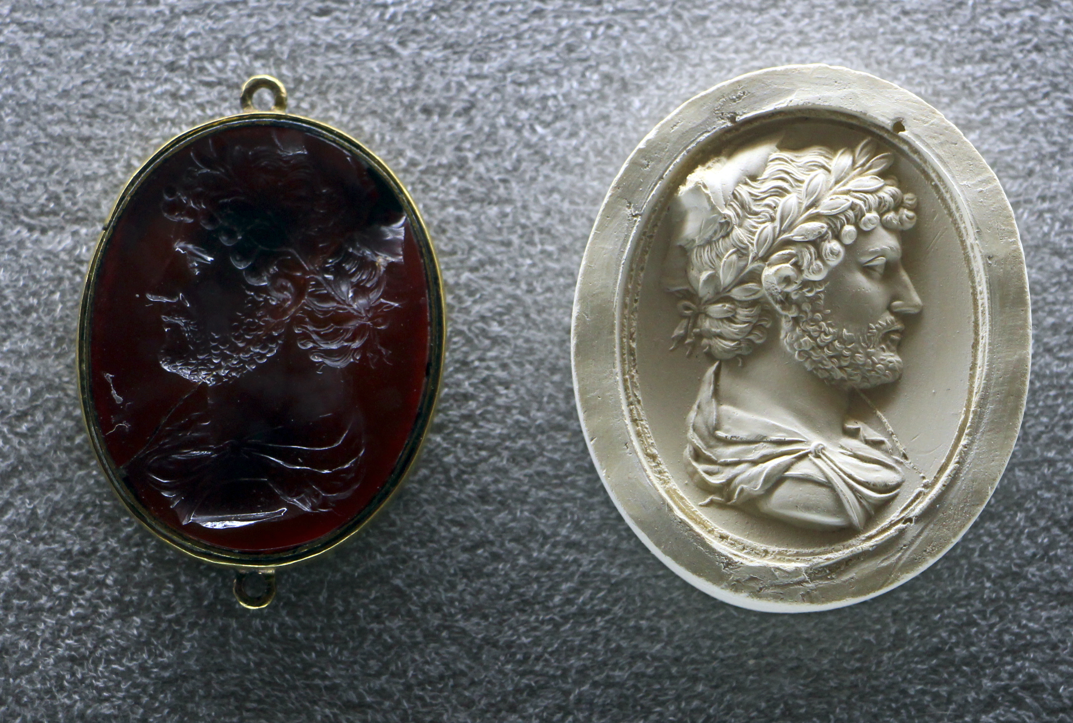 The seal was based on an antique gem, a portrait bust of the Emperor Hadrian most likely, and it was damaged at one point before being repaired. The crack left by that repair can still be seen on both seals if you look closely. It is possible the original looked something like this, an intaglio of the emperor Hadrian now found in the Museo archeologico nazionale in Florence.